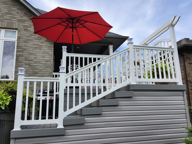 Khaki pool deck with an Espresso accent. Khaki Railing, made custom for customer provided metal spindles. Installed by customer.