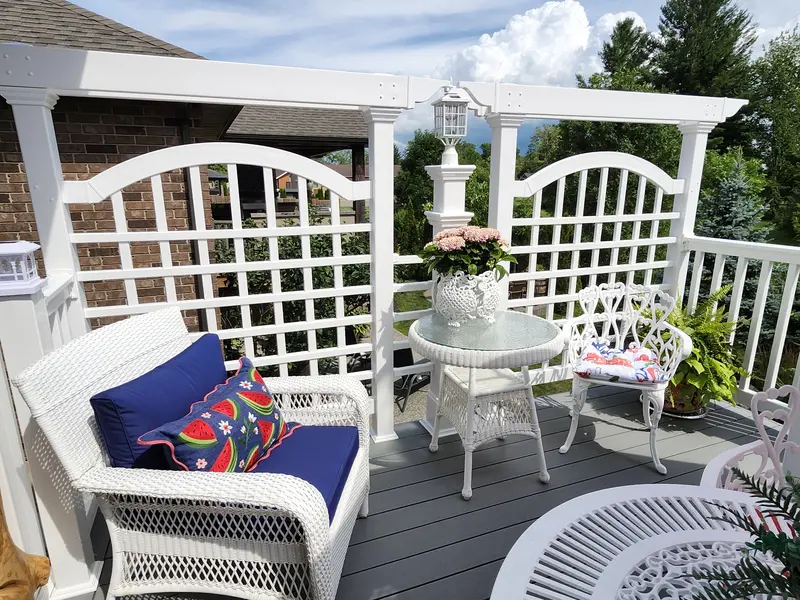 Customer planned out California T-rail around his deck with 2 Manchester Privacy Trellis and a light post between to give them more privacy. Customer worked with Post Time Services for installation and provided his own post caps.